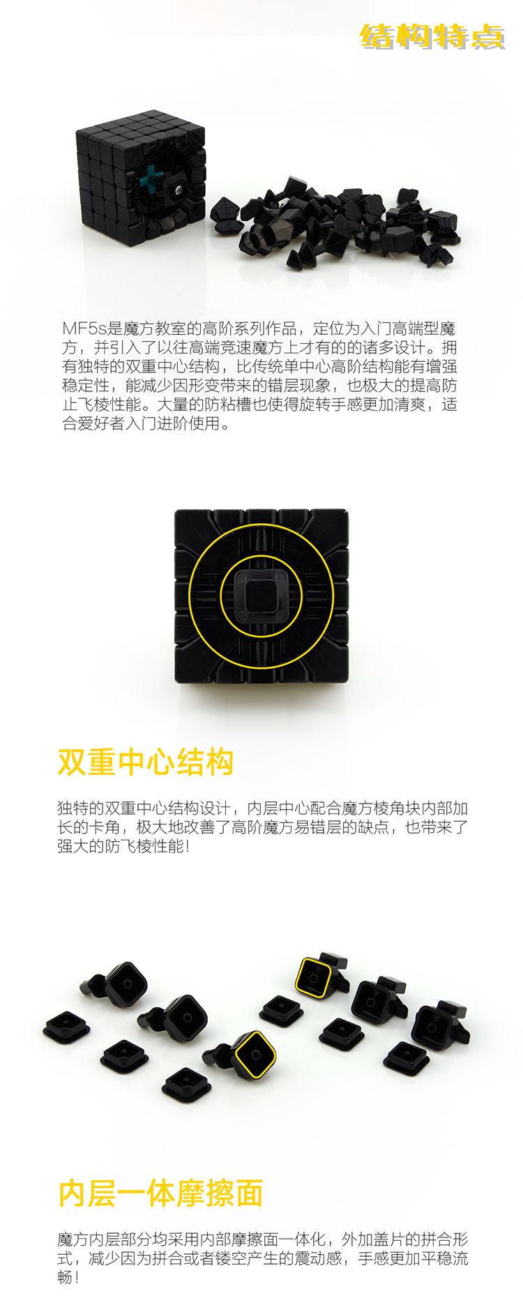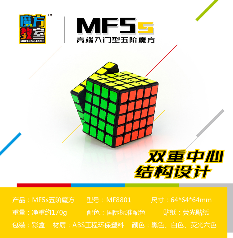 MF5s是魔方教室的高阶系列魔方,定位为高端入门型魔方,并引入了以往高端竞速魔方的诸多设计。拥有独特的双层中心结构,比传统单中心高阶结构能有增强稳定性,能减少因形变带来的错层现象,也极大的提高防止飞棱性能。大量的防粘槽也使得旋转手感更加清爽,适合爱好者入门进阶使用。