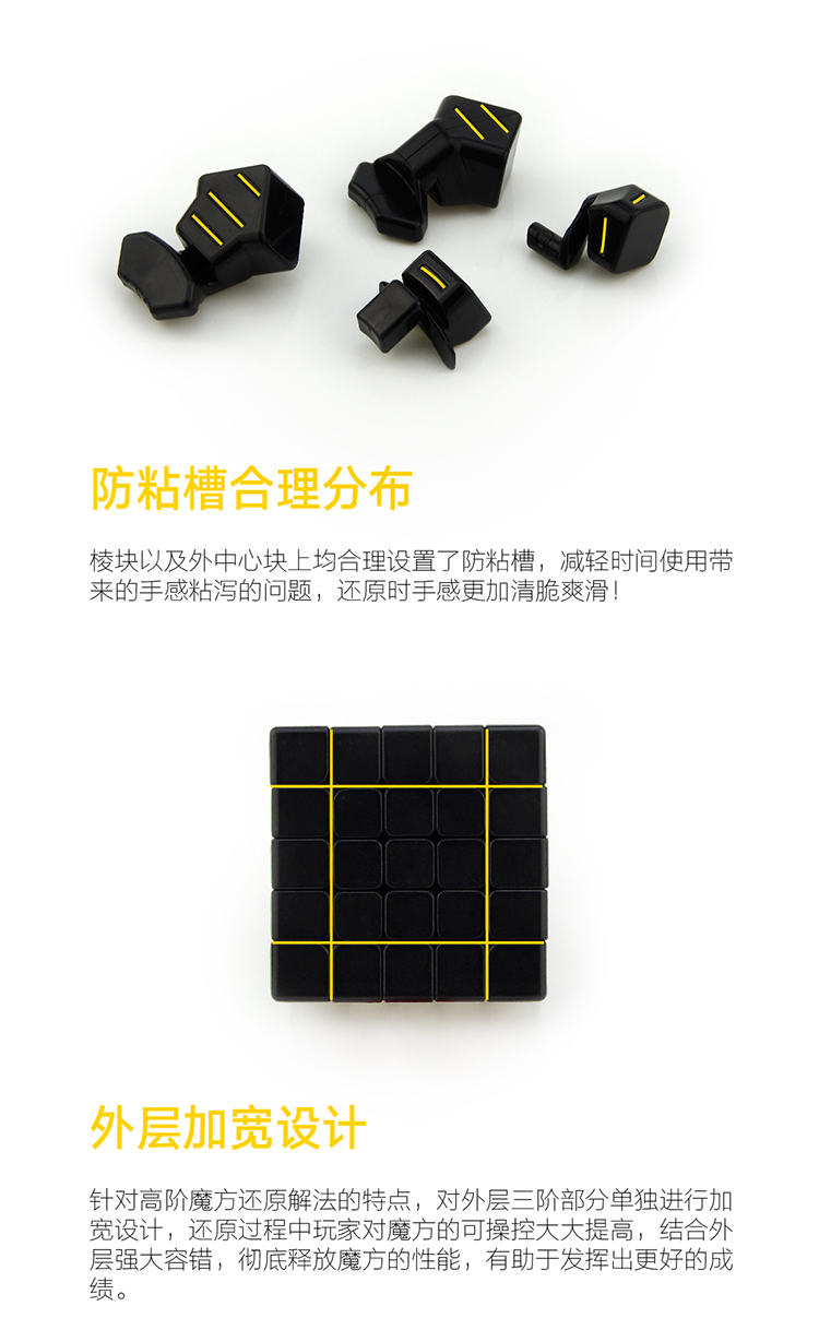 针对高阶魔方还原解法的特点,对外层三阶部分单独进行加宽设计,还原过程中玩家对魔方的可操控大大提高,结合外层超大容错,彻底释放魔方的终极性能,有助于发挥出更好的成绩。