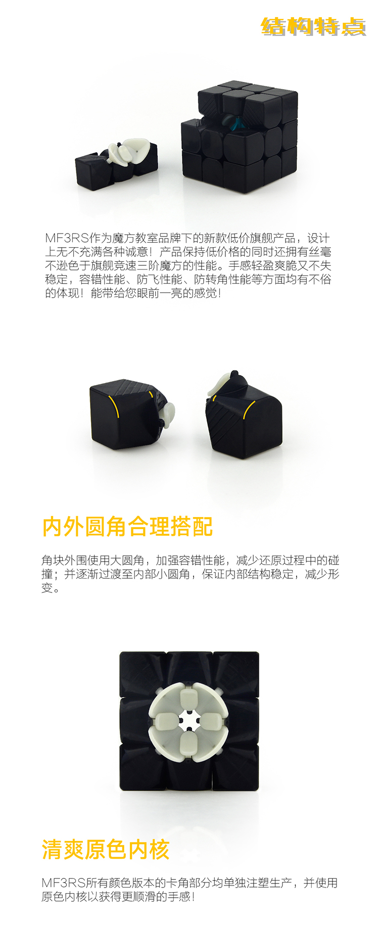 MF3RS作为魔方教室品牌下的新款低价旗舰产品,设计上无不充满各种诚意!产品保持超低价格的同时还拥有丝毫不逊色于旗舰竞速三阶魔方的性能。手感轻盈爽脆又不失稳定,容错性能、防飞性能、防转角性能等方面均有不俗的体现!能带给您眼前一亮的感觉!