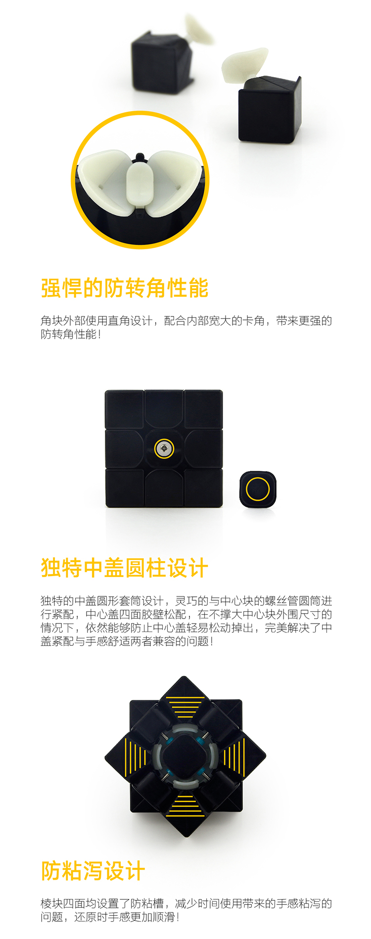棱块四面均设置了防粘槽,减少时间使用带来的手感粘泻的问题,还原时手感更加顺滑! |