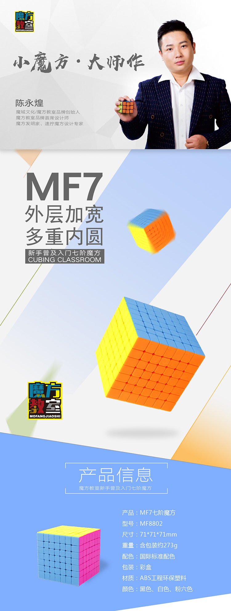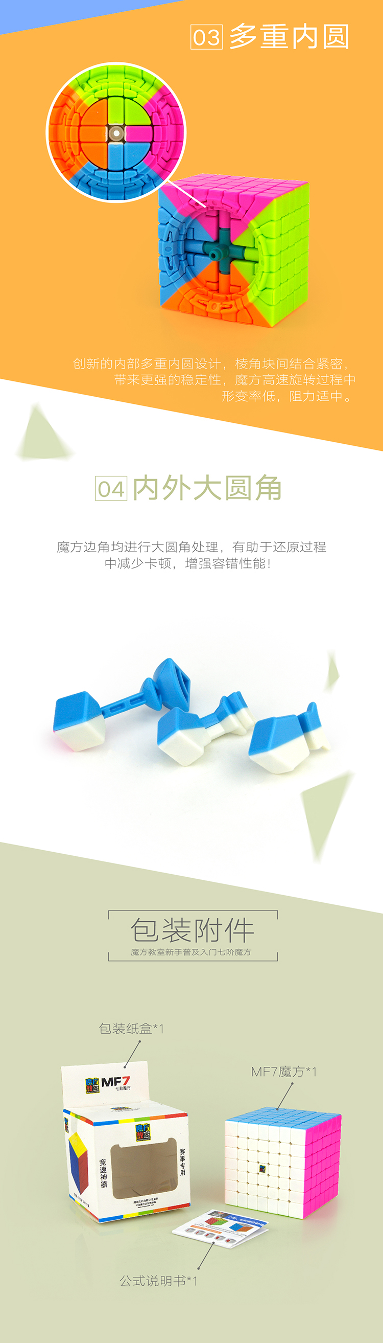 MF7是魔方教室的七阶系列魔方,虽然定位为入门型魔方,却比以往的入门型魔方拥有更加良好的性能。内部棱角块配合紧密,形成多重内圆,转动更加平稳,减少飞棱情况的发生。内部一体摩擦面设计,增强魔方旋转时的稳定性,减少卡顿,手感更加顺畅!适合爱好者入门使用。