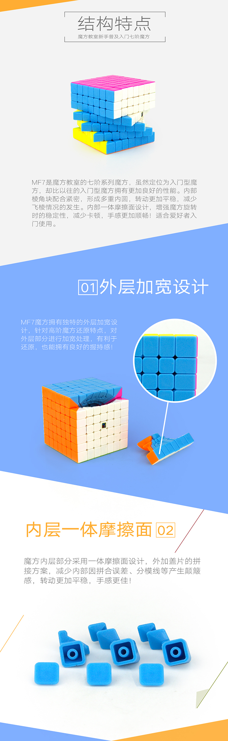 MF7拥有独特的外层加宽设计,针对高阶魔方还原特点,对外层部分进行加宽处理,有利于还原,也能拥有良好的握持感。
