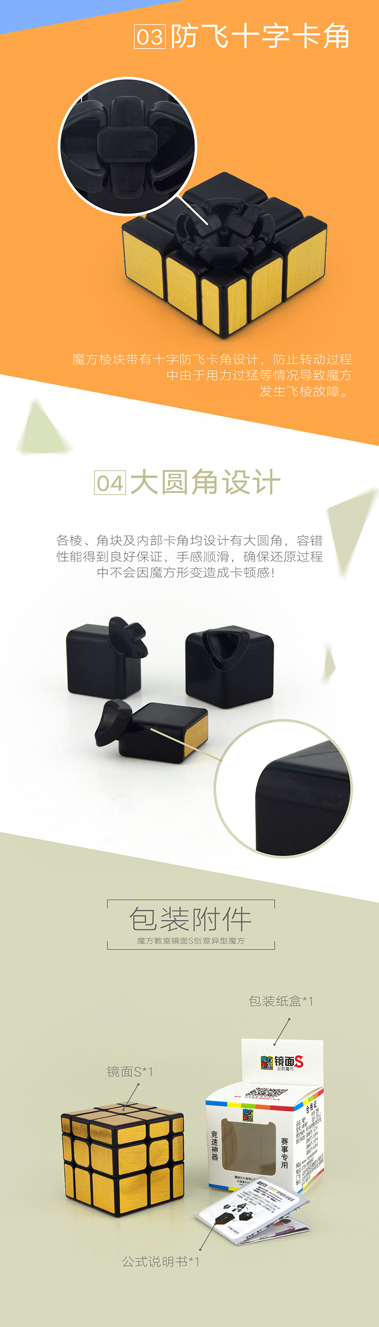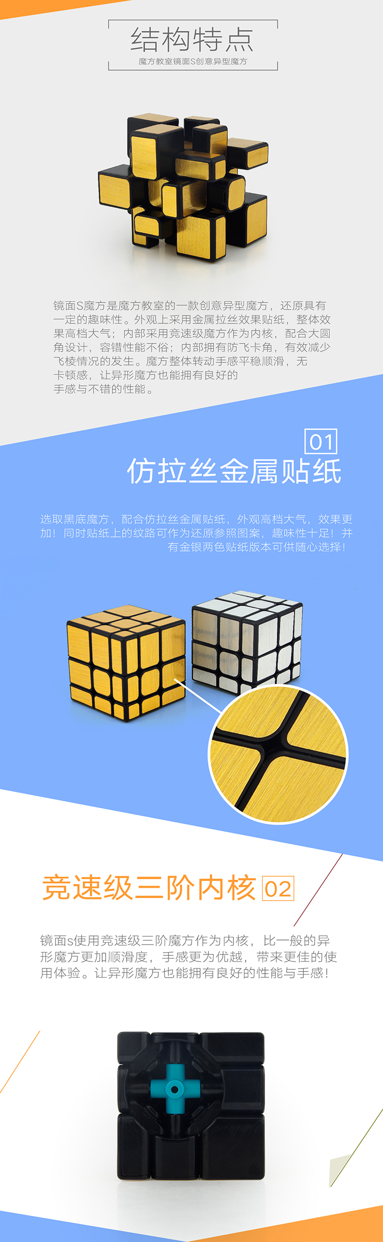 镜面s使用竞速级三阶魔方作为内核,比一般的异形魔方更加顺滑度,手感更为优越,带来更佳的使用体验。让异形魔方也能拥有良好的性能与手感!