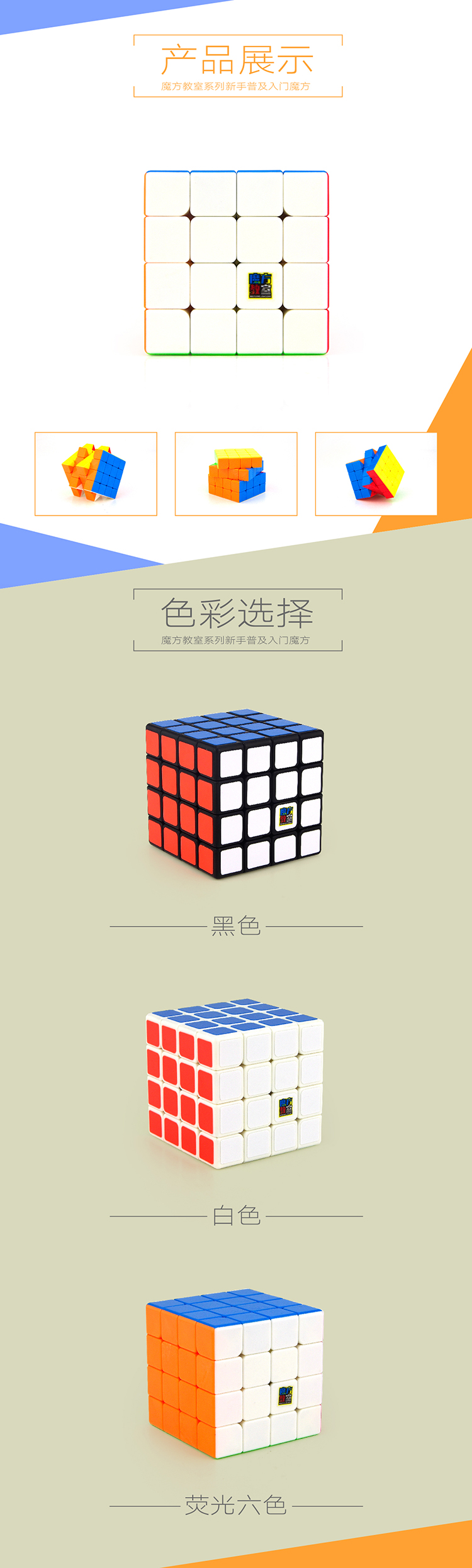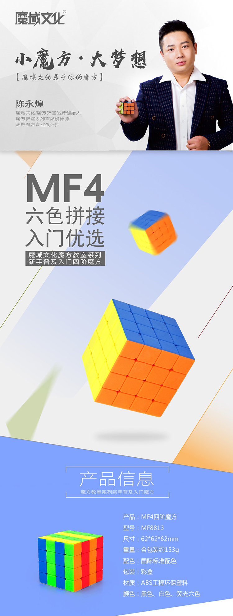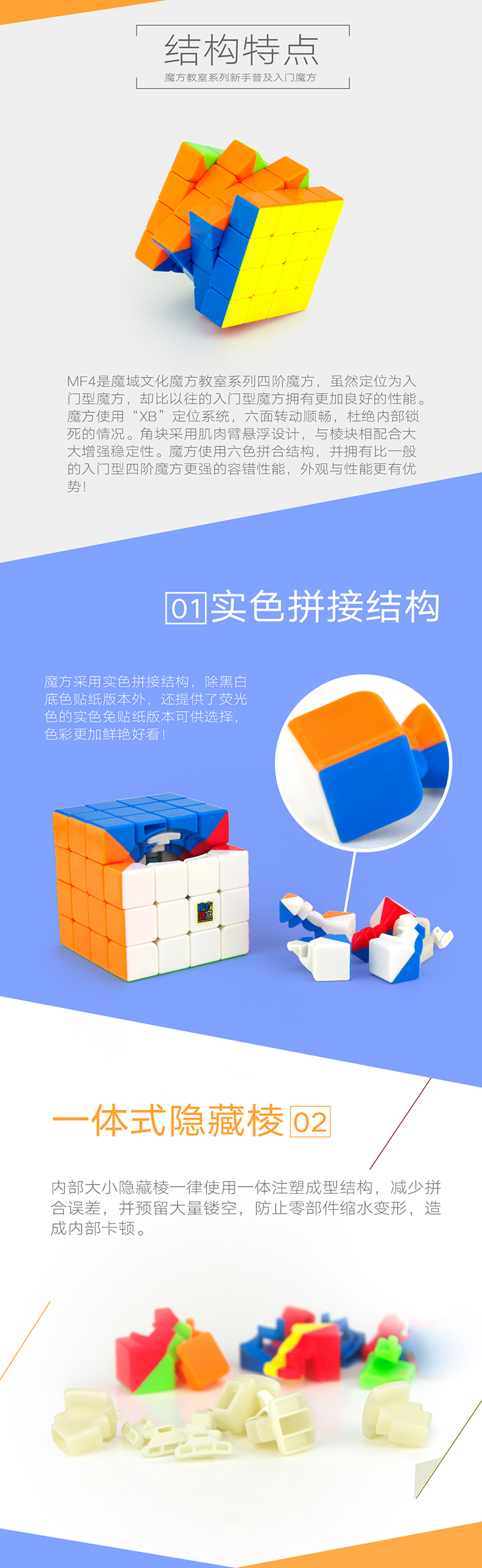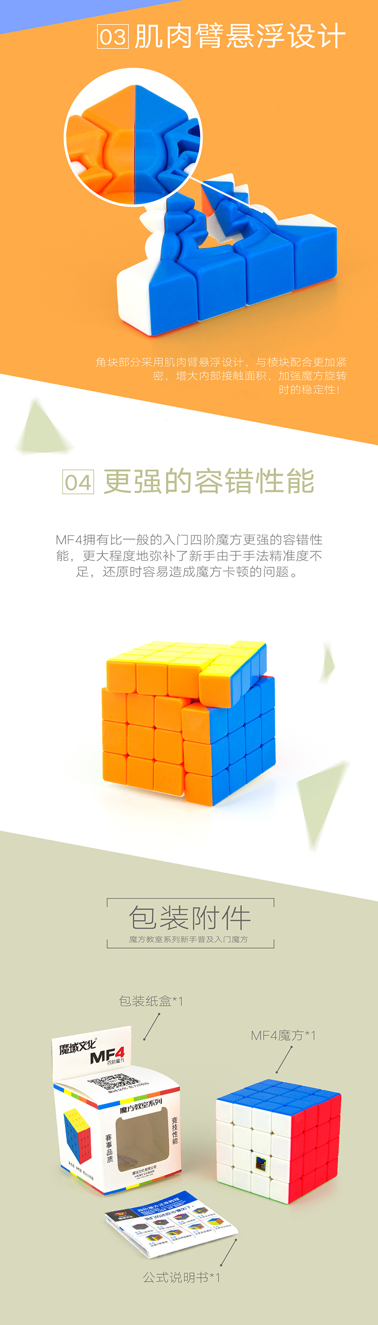MF4是魔方教室的四阶系列魔方,虽然定位为入门型魔方,却比以往的入门型魔方拥有更加良好的性能。魔方使用”XB”定位系统,六面转动顺畅,杜绝内部锁死。角块采用肌肉臂悬浮设计,与棱块相配合大大增强稳定性。魔方使用六色拼合结构,并拥有比一般入门型四阶魔方更强的容错性能,外观与性能更有优势。