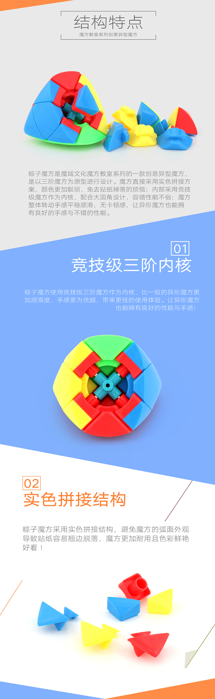 粽子魔方采用实色拼接结构,避免魔方的弧面外观导致贴纸容易翘边脱落,魔方更加耐用且色彩鲜艳好看!