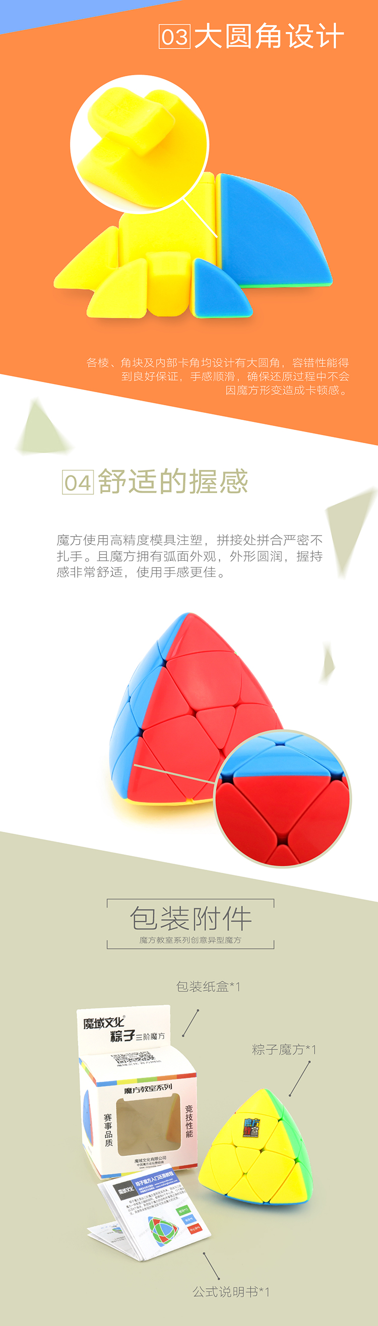 粽子魔方使用竞技级三阶魔方作为内核,比一般的异形魔方更加顺滑度,手感更为优越,带来更佳的使用体验。让异形魔方也能拥有良好的性能与手感!