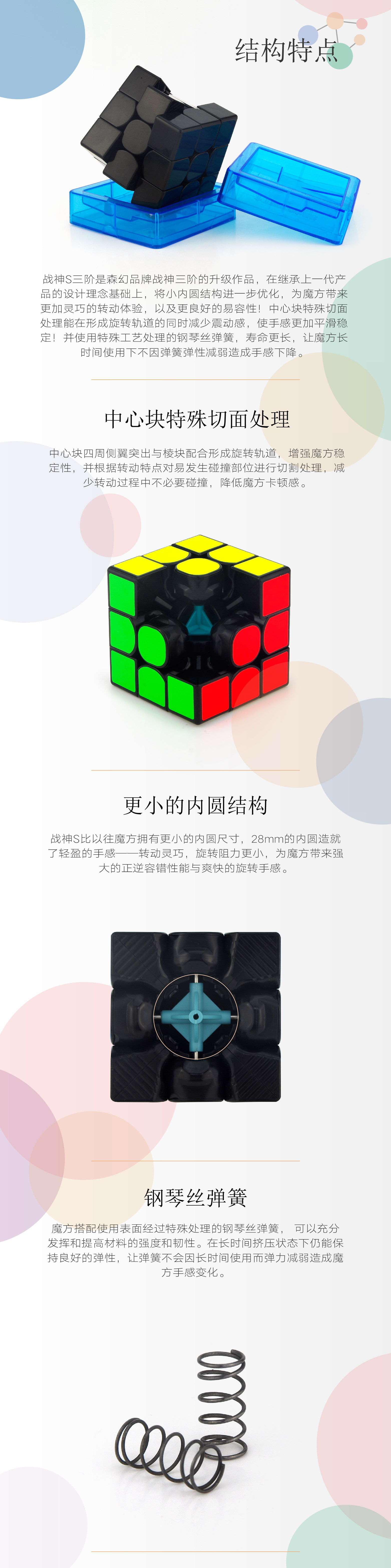 战神S三阶是森幻品牌战神三阶的升级作品,在继承上一代产品的设计理念基础上,将小内圆结构进一步优化,为魔方带来更加灵巧的转动体验,以及更良好的易容性!中心块特殊切面处理能在形成旋转轨道的同时减少震动感,使手感更加平滑稳定!并使用特殊工艺处理的钢琴丝弹簧,寿命更长,让魔方长时间使用下不因弹簧弹性减弱造成手感下降。