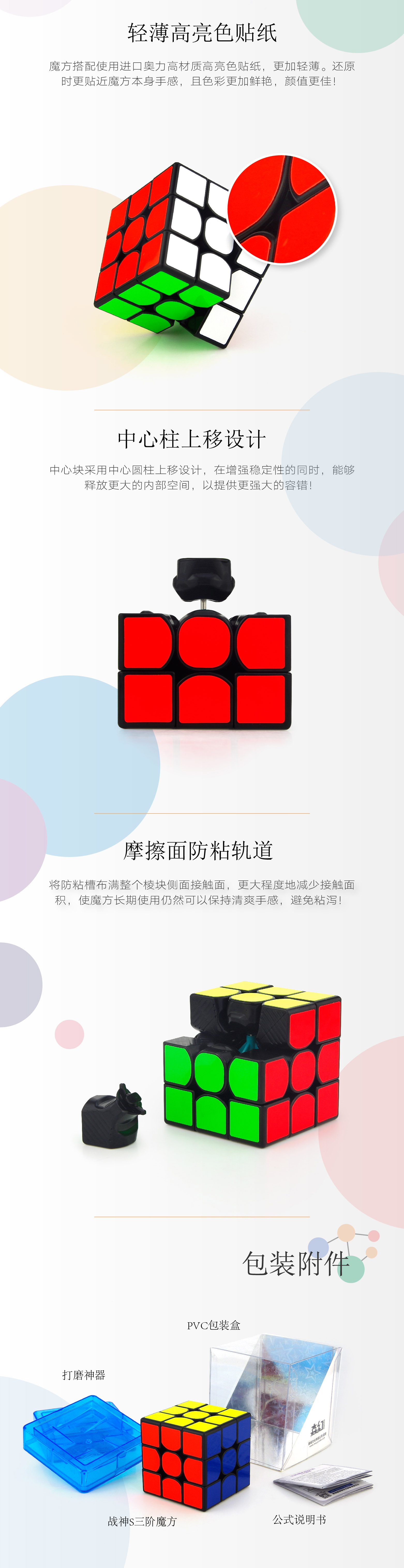 魔方搭配使用进口奥力高材质高亮色贴纸,更加轻薄。还原时更贴近魔方本身手感,且色彩更加鲜艳,颜值更佳!