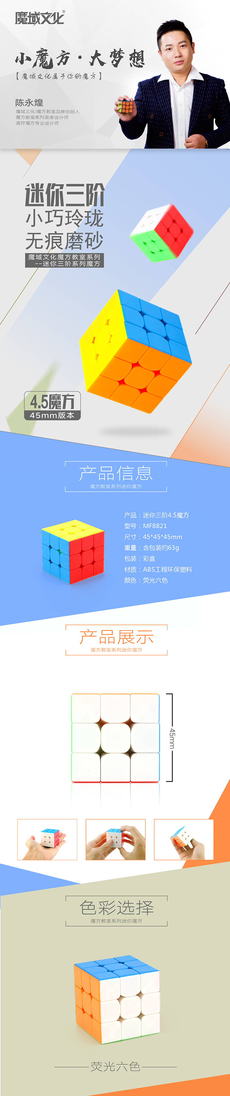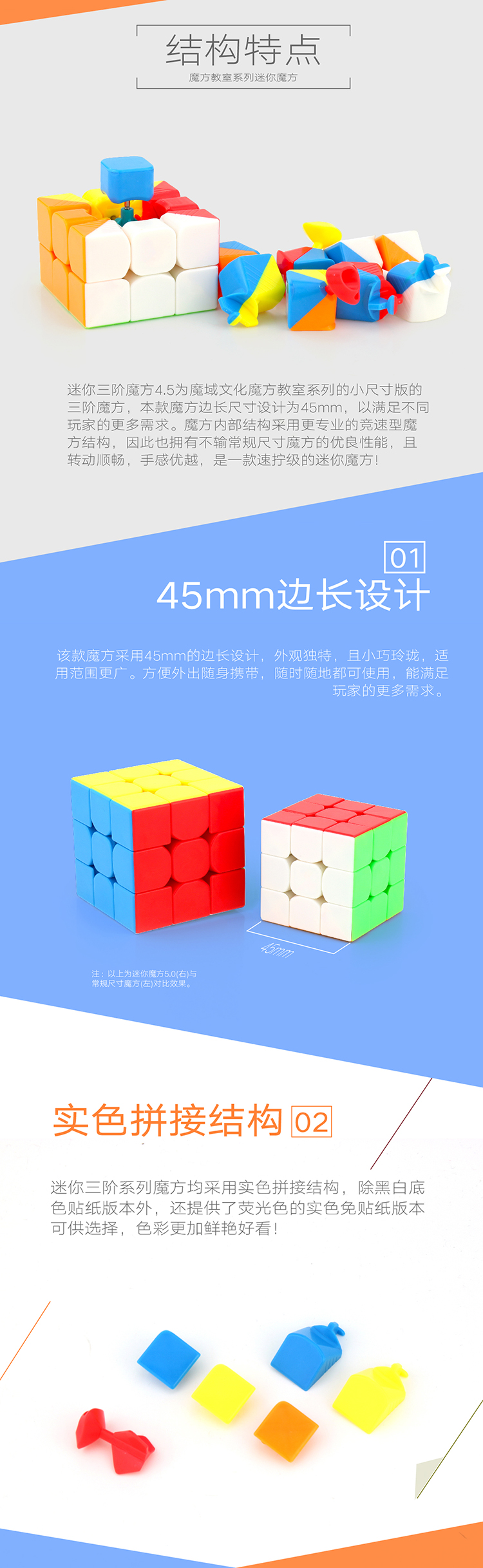 迷你三阶魔方4.5为魔域文化魔方教室系列的小尺寸版的三阶魔方,本款魔方边长尺寸设计为45mm,以满足不同玩家的更多需求。魔方内部结构采用更专业的竞速型魔方结构,因此也拥有不输常规尺寸魔方的优良性能,且转动顺畅,手感优越,是一款速拧级的迷你魔方!