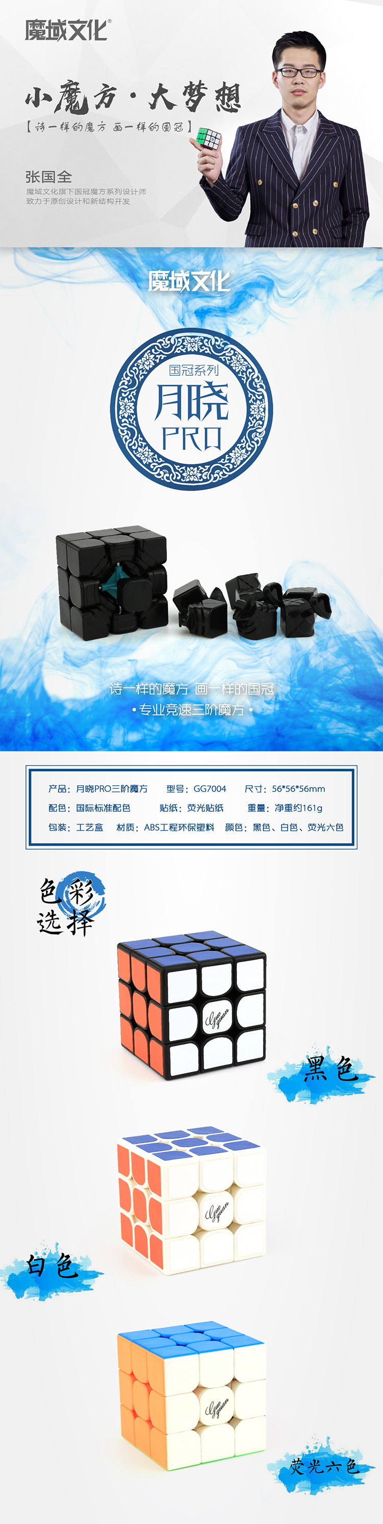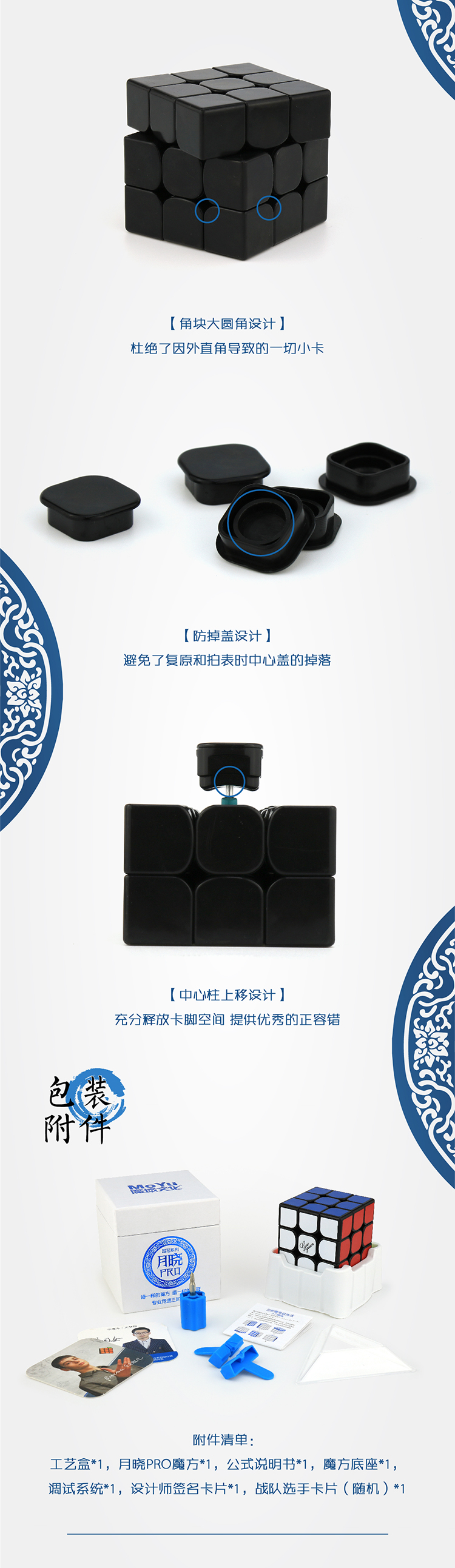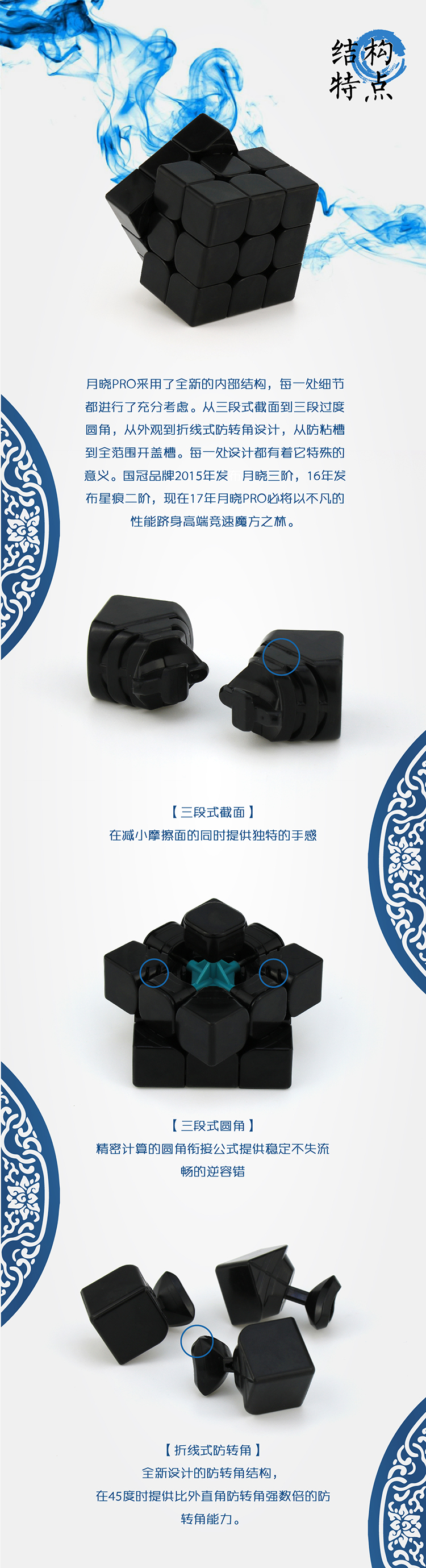 月晓PRO采用了全新的内部结构,每一处细节都进行了充分考虑。从三段式截面到三段过度圆角,从外观到折线式防转角设计,从防粘槽到全范围开盖槽。每一处设计都有着它特殊的意义。国冠品牌2015年发布月晓三阶,16年发布星痕二阶,现在17年月晓PRO必将以不凡的性能跻身高端竞速魔方之林。 |
