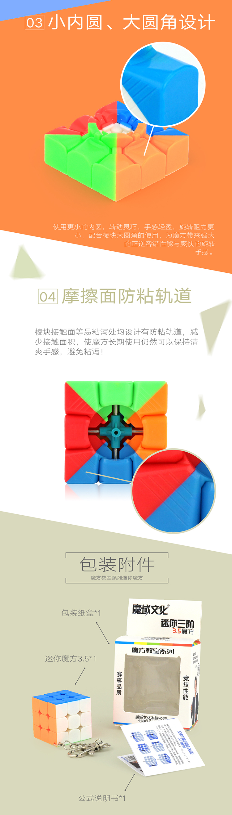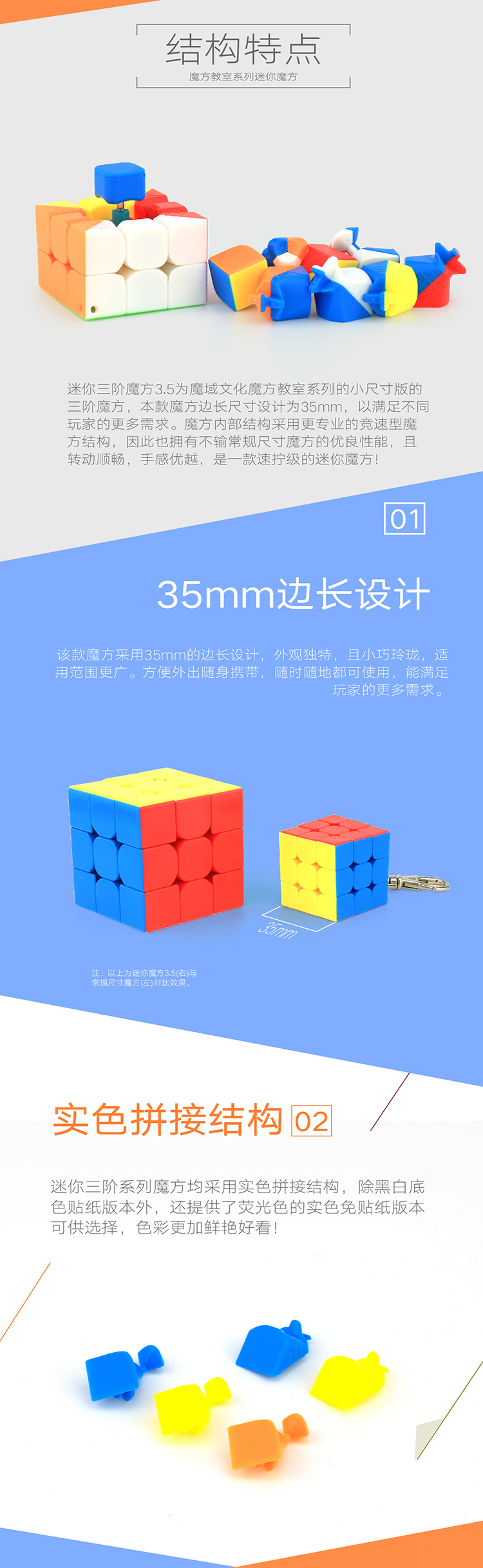 迷你三阶魔方3.5为魔域文化魔方教室系列的小尺寸版的三阶魔方,本款魔方边长尺寸设计为35mm,以满足不同玩家的更多需求。魔方内部结构采用更专业的竞速型魔方结构,因此也拥有不输常规尺寸魔方的优良性能,且转动顺畅,手感优越,是一款速拧级的迷你魔方!
