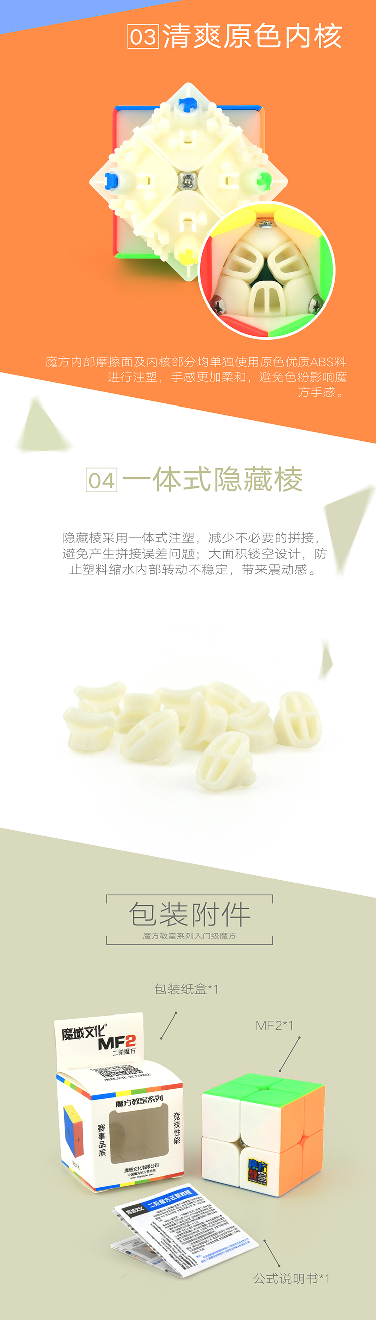 魔方内部摩擦面及内核部分均单独使用原色优质ABS料进行注塑,手感更加柔和,避免色粉影响魔方手感。