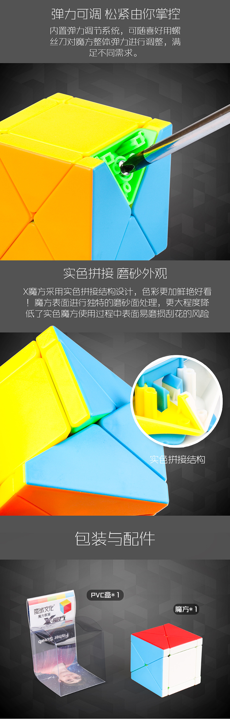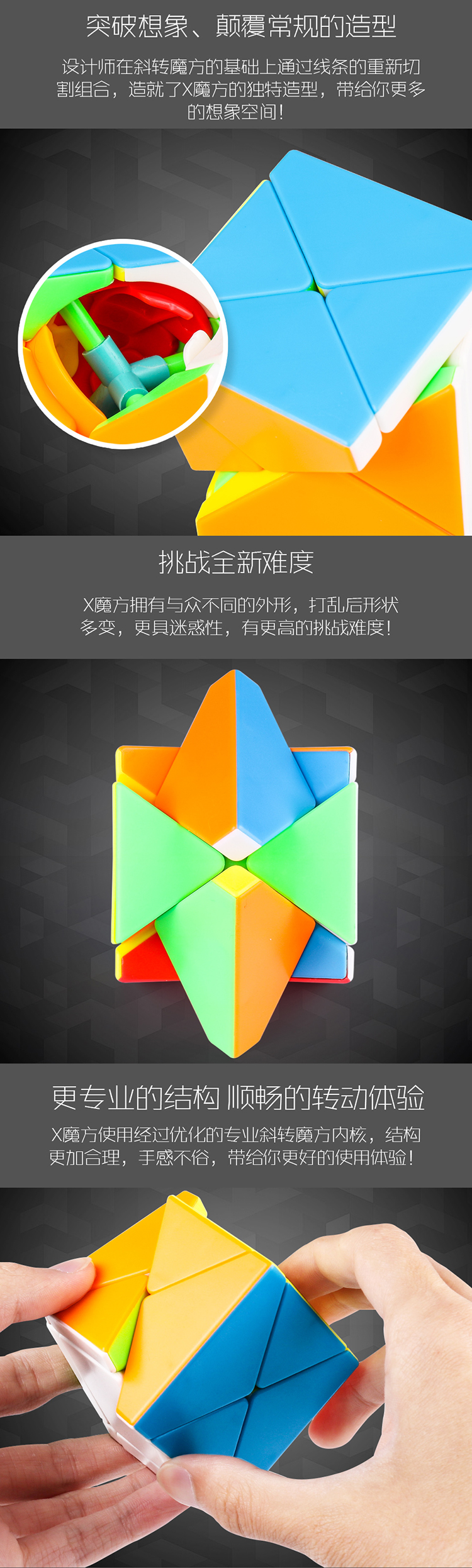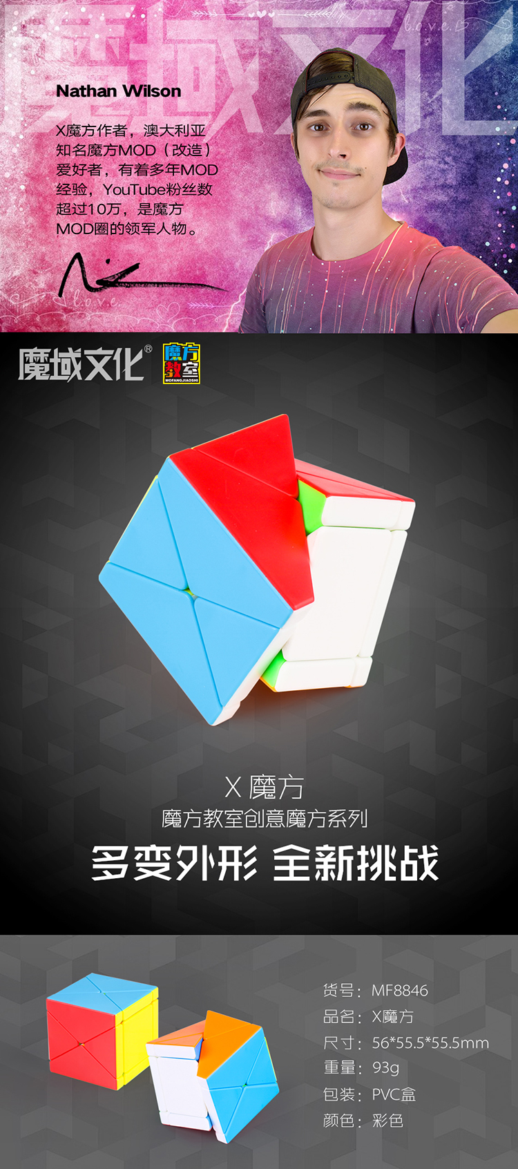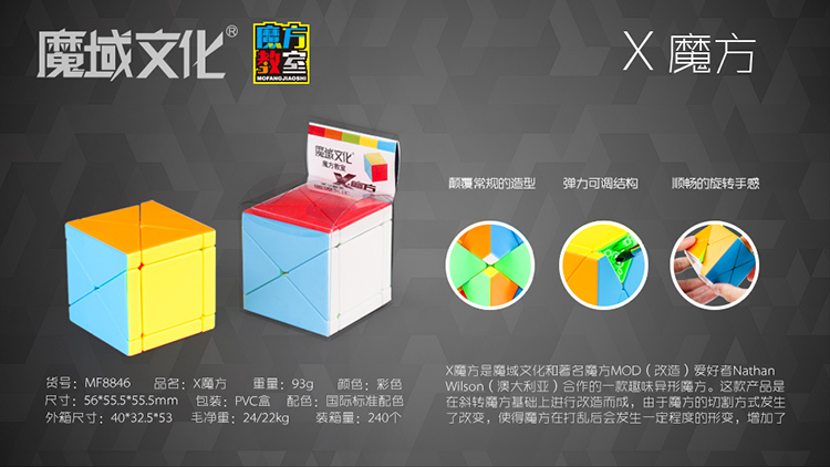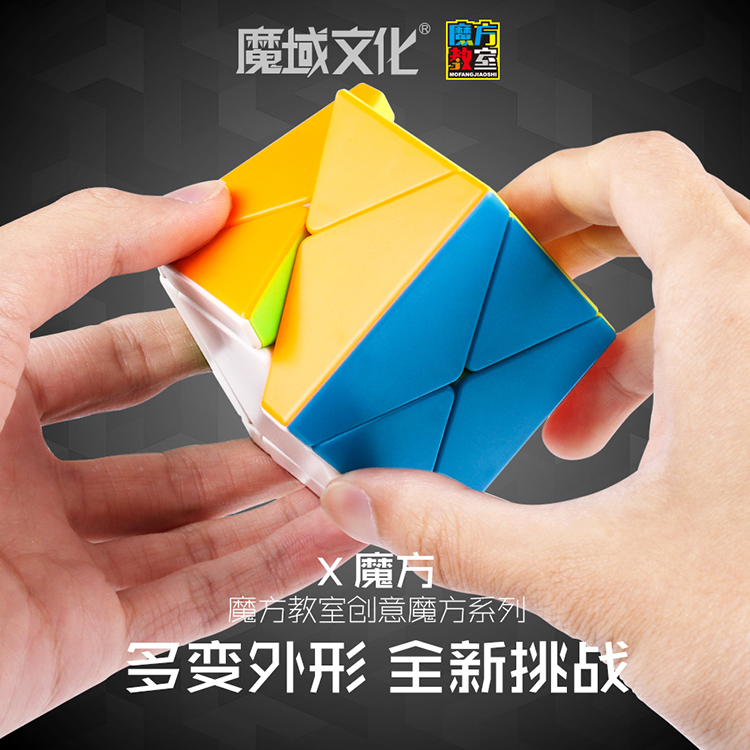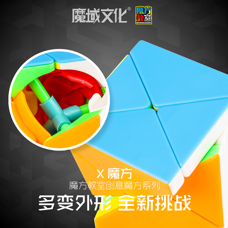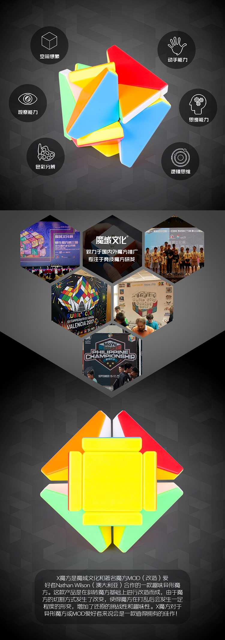 X魔方是魔域文化和著名魔方MOD(改造)爱好者Nathan Wilson(澳大利亚)合作的一款趣味异形魔方。这款产品是在斜转魔方基础上进行改造而成,由于魔方的切割方式发生了改变,使得魔方在打乱后会发生一定程度的形变,增加了还原的挑战性和趣味性。X魔方对于异形魔方或MOD爱好者来说会是一款值得拥有的佳作!