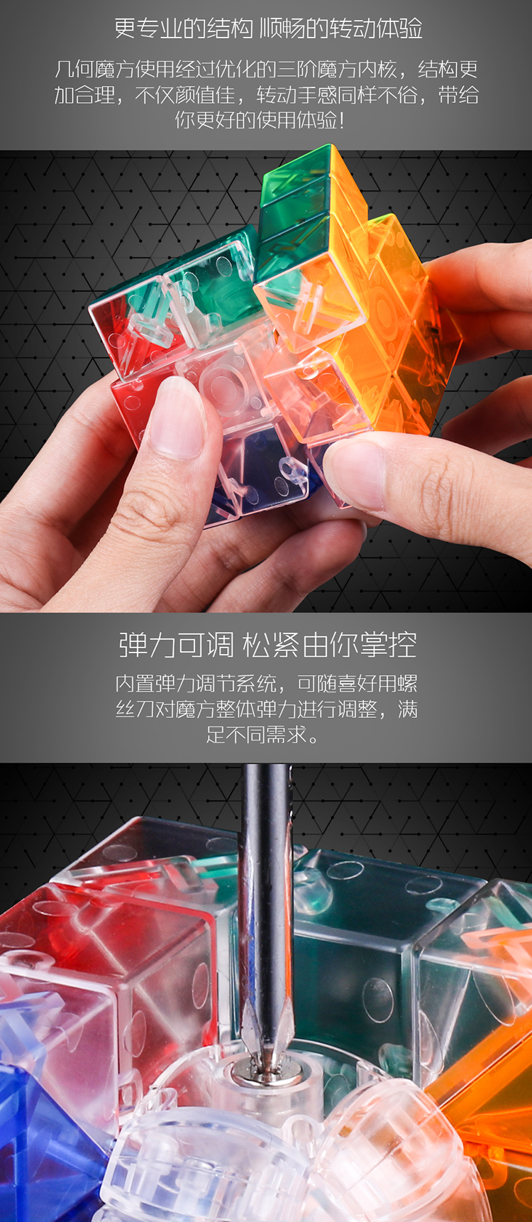 几何魔方使用经过优化的三阶魔方内核,结构更加合理,不仅颜值佳,转动手感同样不俗,带给你更好的使用体验!