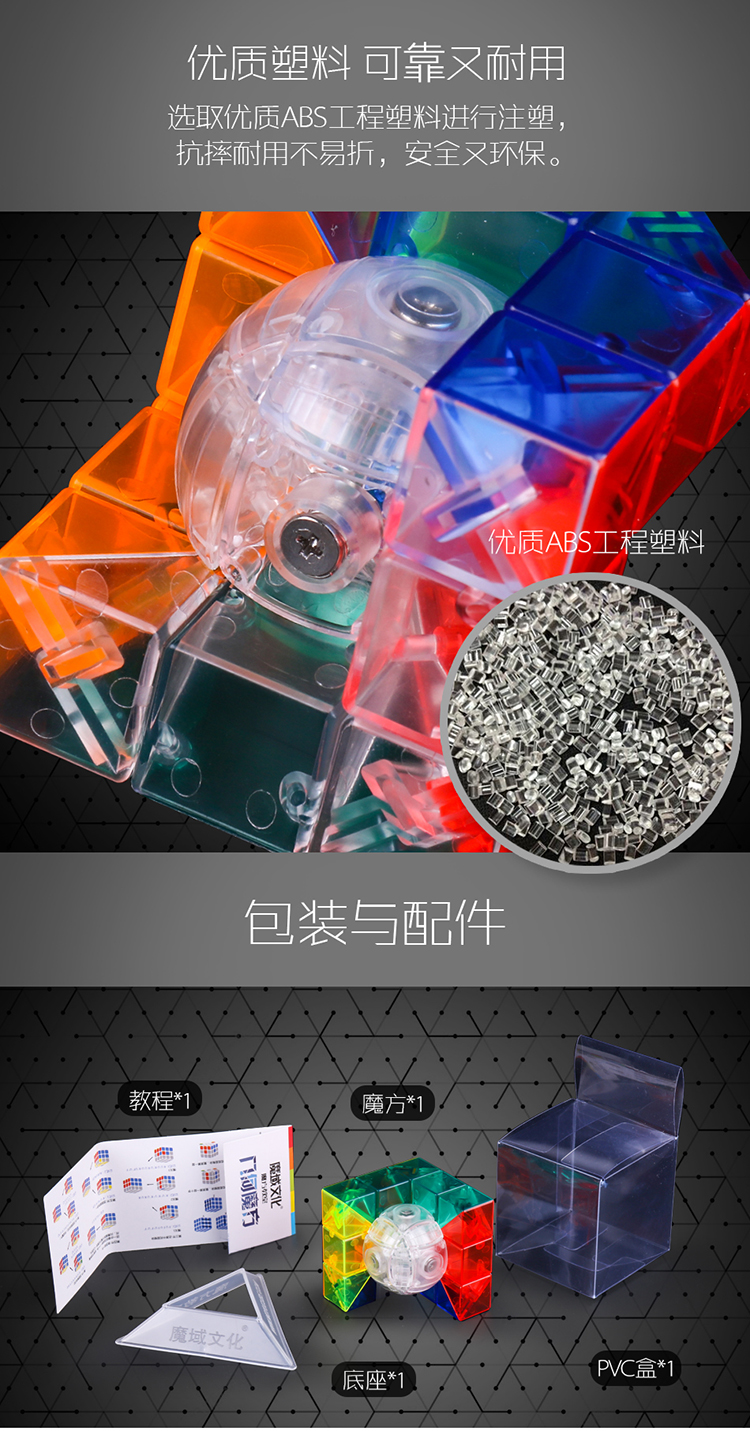 魔方采用透明ABS料注塑而成,材质晶莹剔透,外观靓丽,观赏度高,收藏送礼俱佳!