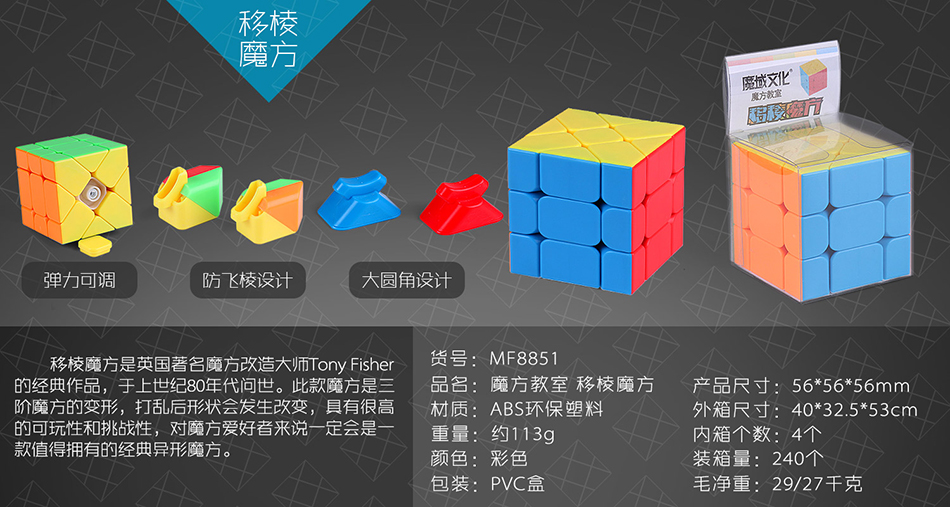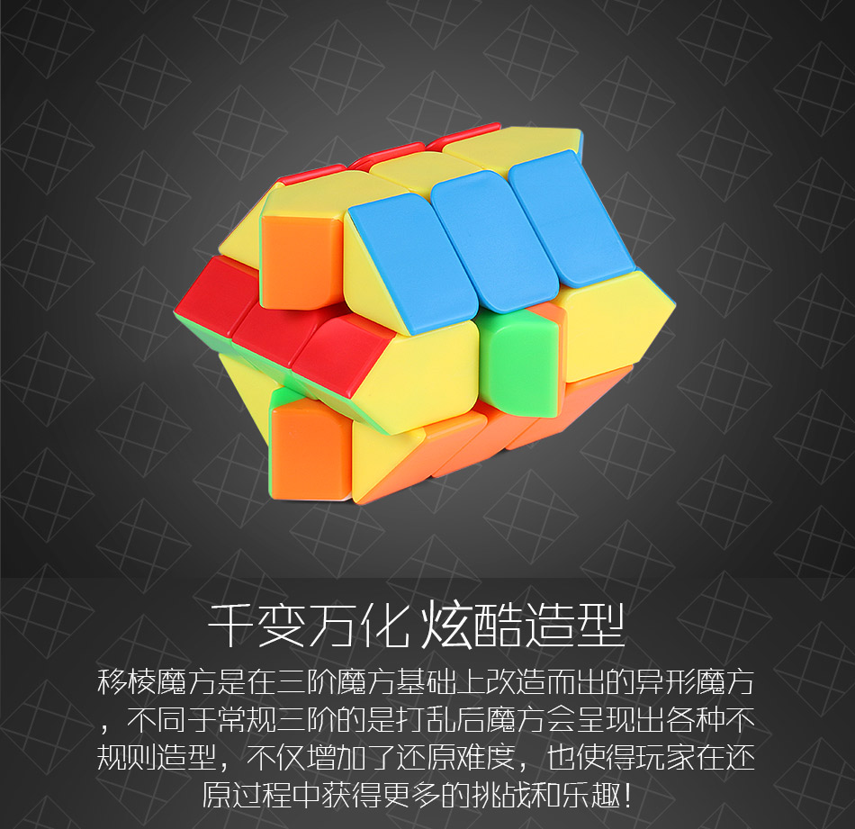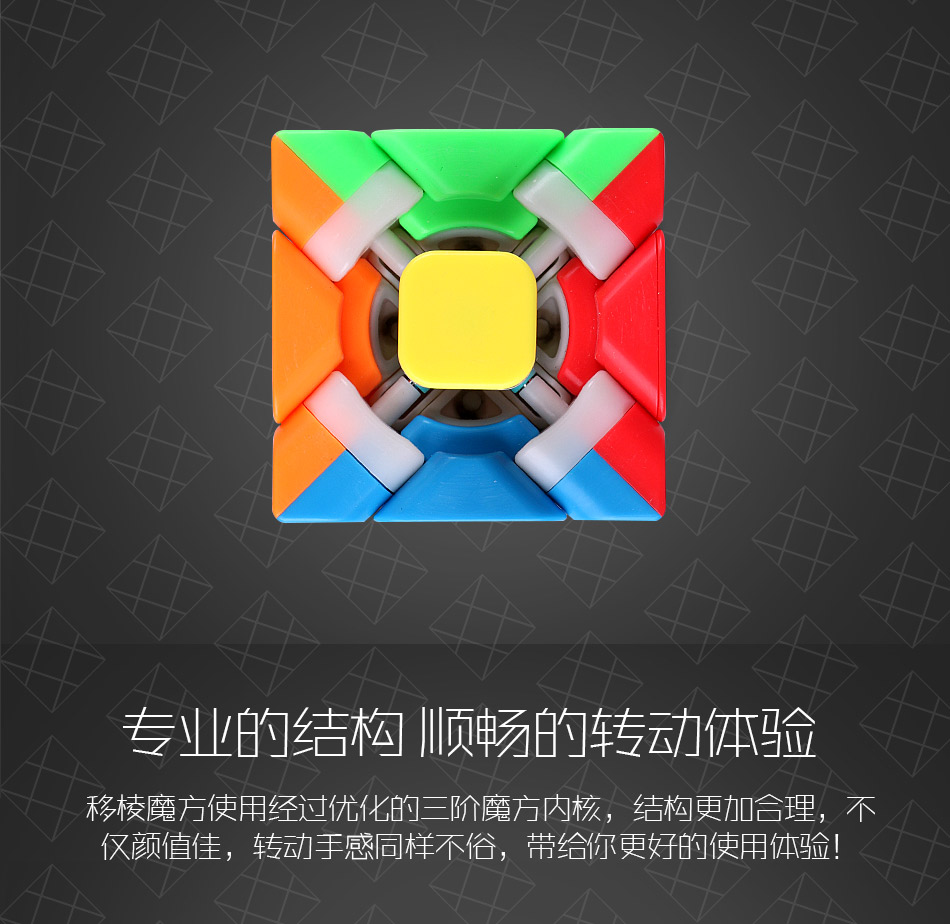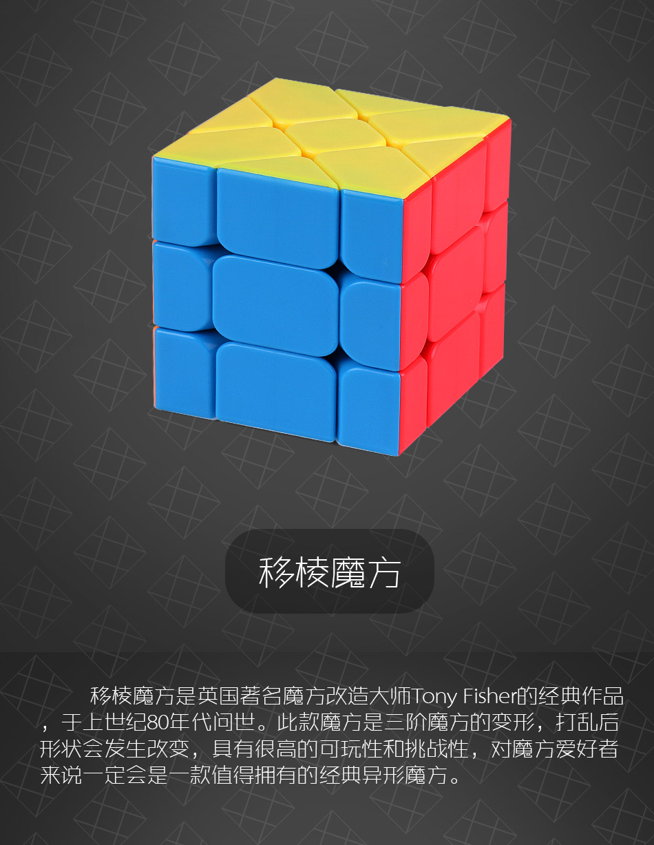 移棱魔方是英国著名魔方改造大师Tony Fisher的经典作品,于上世纪80年代问世。此款魔方是三阶魔方的变形,打乱后形状会发生改变,具有很高的可玩性和挑战性,对魔方爱好者来说一定会是一款值得拥有的经典异形魔方。