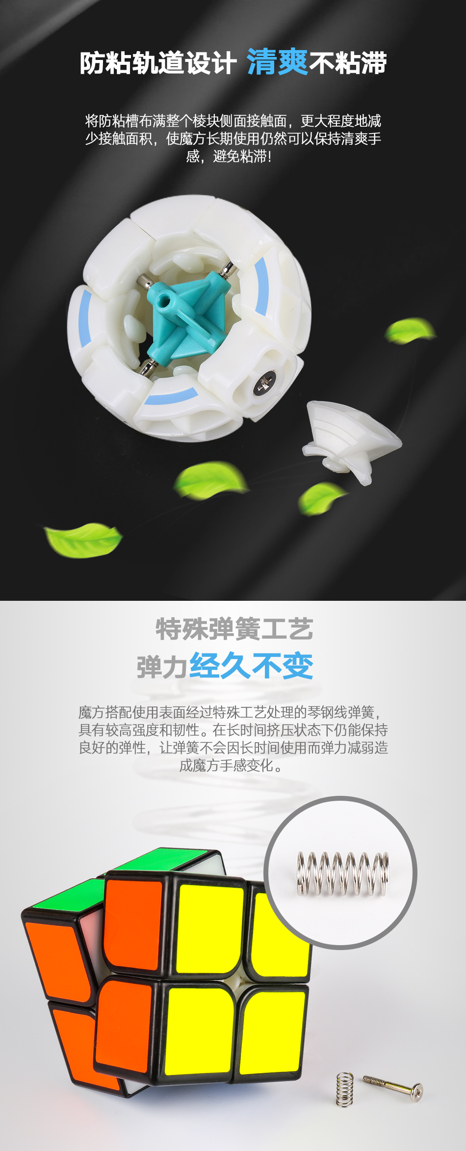 特殊弹簧工艺 弹力经久不变 魔方搭配使用表面经过特殊工艺处理的钢琴线弹簧, 具有较高强度和韧性。在长时间挤压状态下仍能保持良好的弹性,让弹簧不会因长时间使用而弹力减弱造成魔方手感变化。