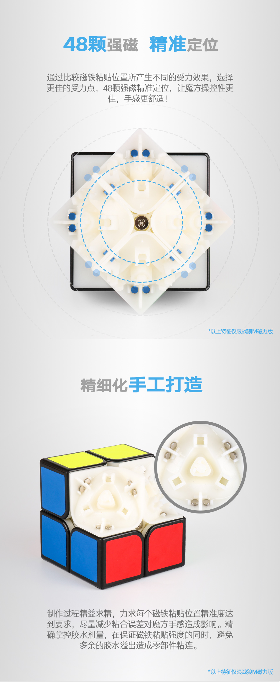 战狼M磁力版 精细化手工打造 制作过程精益求精,力求每个磁铁粘贴位置精准度达到要求,尽量减少粘合误差对魔方手感造成影响。精确掌控胶水剂量,在保证磁铁粘贴强度的同时,避免多余的胶水溢出造成零部件粘连。