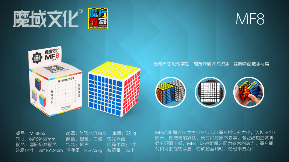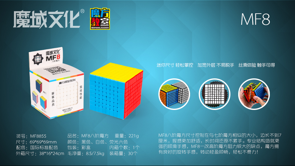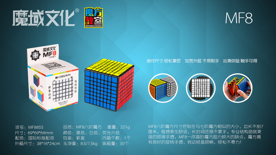MF8八阶魔方尺寸控制在与七阶魔方相似的大小,边长不到7厘米,握感更加舒适,长时间还原不累手。