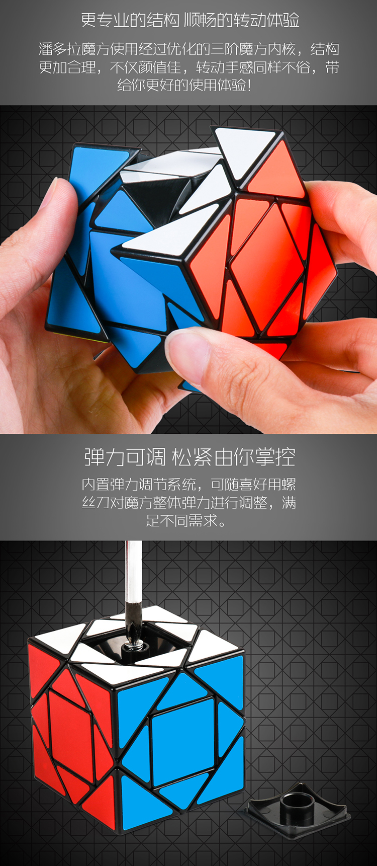 潘多拉魔方使用经过优化的三阶魔方内核,结构更加合理,不仅颜值佳,转动手感同样不俗,带给你更好的使用体验!