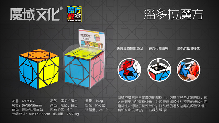 更具迷惑性的造型 潘多拉魔方在三阶魔方的基础上,调整了线条切割方向,使之出现更加的有趣外 形,外观更具迷惑性!