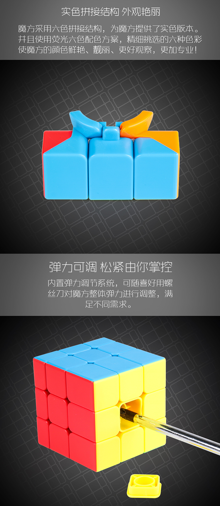 内置弹力调节系统,可用随喜好螺丝刀对魔方整体弹力进行调整,满足不同需求