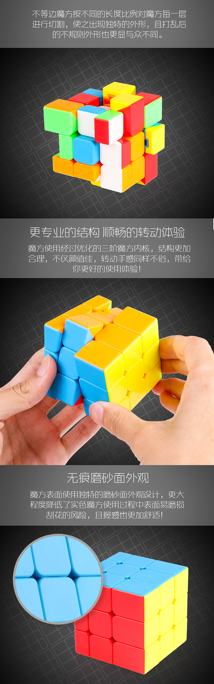 不等边魔方按不同的长度比例对魔方每一层进行切割,使之出现独特的外形,且打乱后的不规则外形也更显与众不同。
