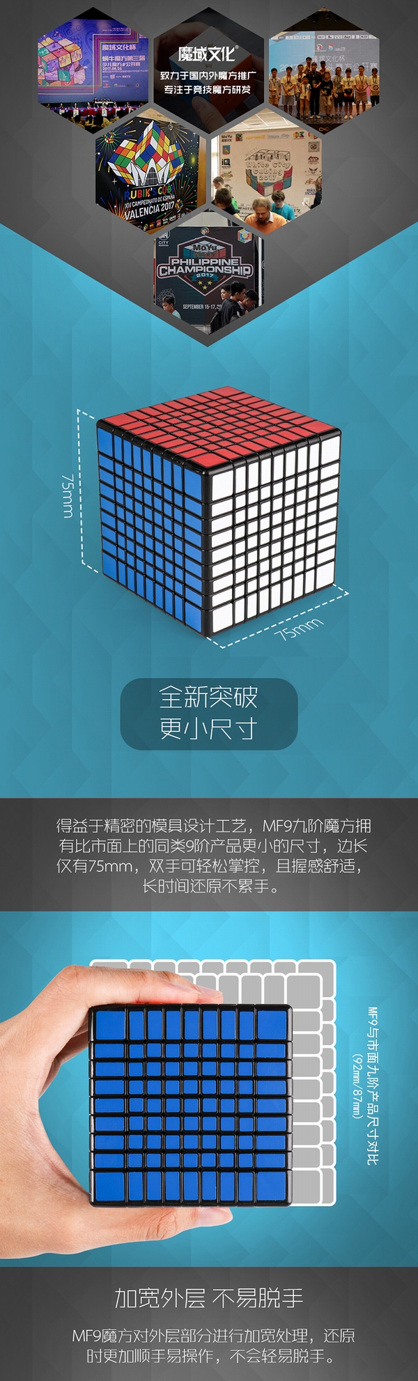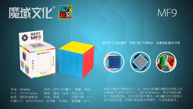 全新突破 更小尺寸! 得益于精密的模具设计工艺,MF9九阶魔方拥有比市面上的同类9阶产品更小的尺寸,边长仅有75mm,双手可轻松掌控,且握感舒适,长时间还原不累手。