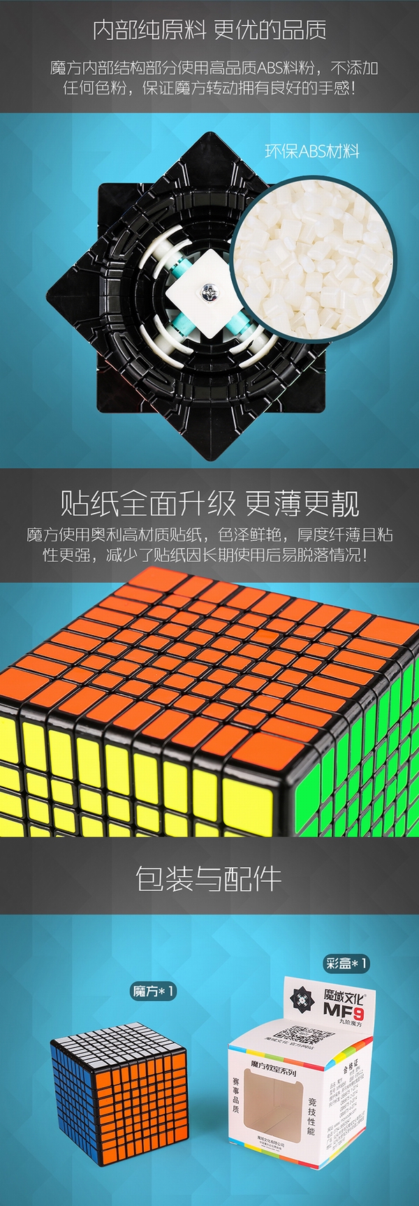 内部纯原料 更优的品质 魔方内部结构部分使用高品质ABS料粉,不添加任何色粉,保证魔方转动拥有良好的手感! |