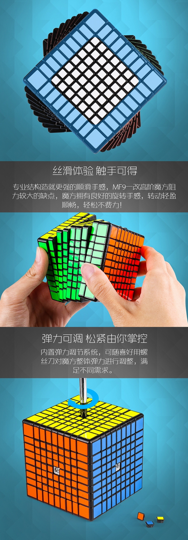 丝滑体验 触手可得 专业结构造就更强的顺滑手感,MF9一改高阶魔方阻力较大的缺点,魔方拥有良好的旋转手感,转动轻盈顺畅,轻松不费力!