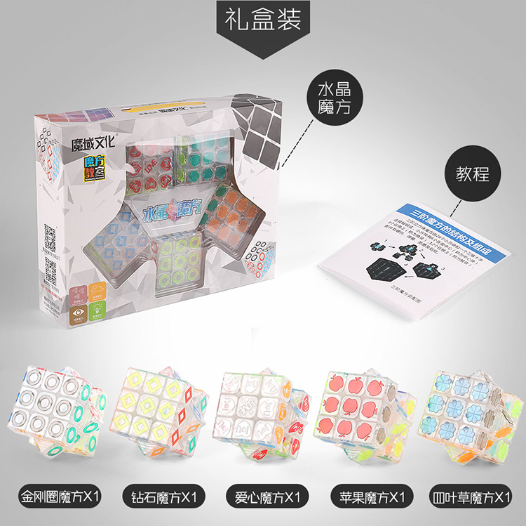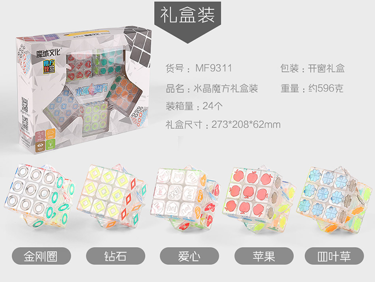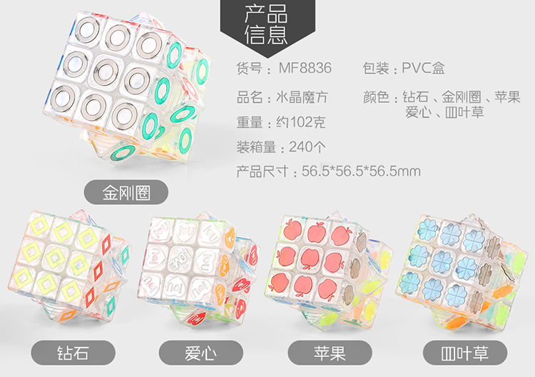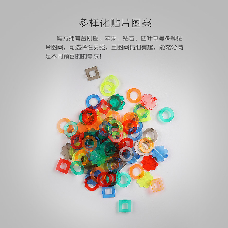 魔方拥有金刚圈、苹果、钻石、四叶草等多种贴片图案,可选择性更强,且图案精细有趣,能充分满足不同顾客的的需求!
