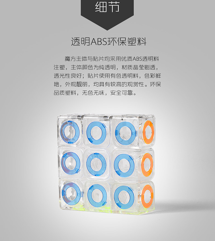魔方主体与贴片均采用优质ABS透明料注塑,主体颜色为纯透明,材质晶莹剔透,透光性良好;贴片使用有色透明料,色彩鲜艳,外观靓丽,均具有较高的观赏性。环保品质塑料,无色无味,安全可靠。