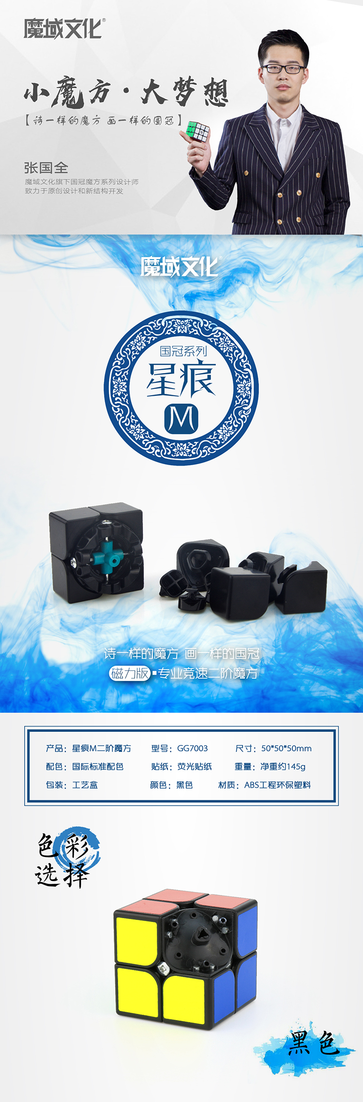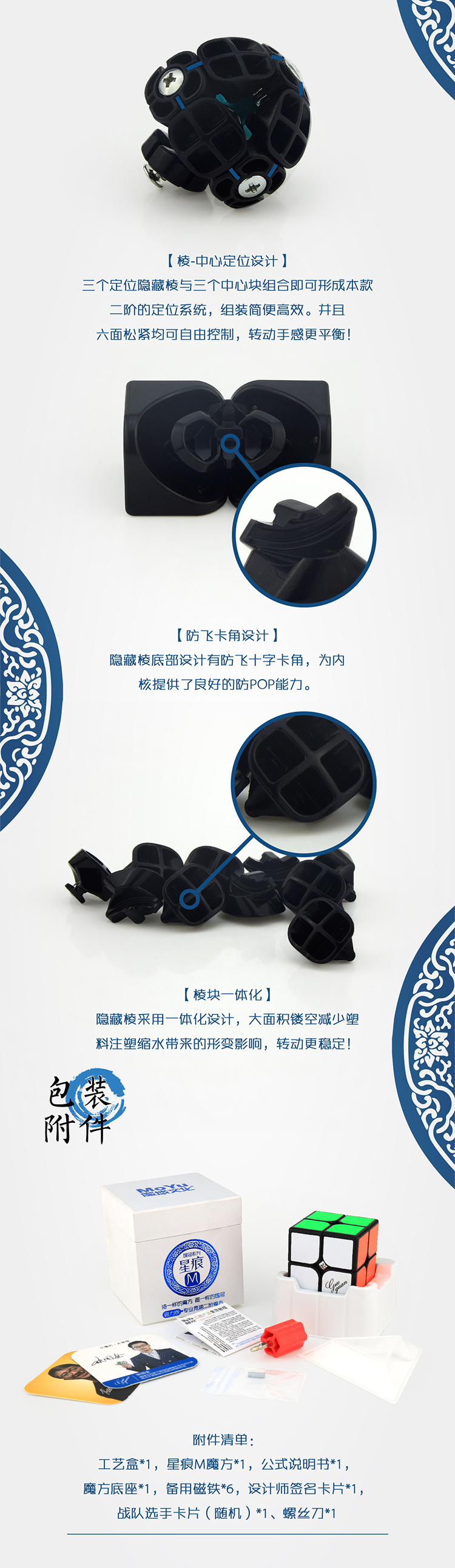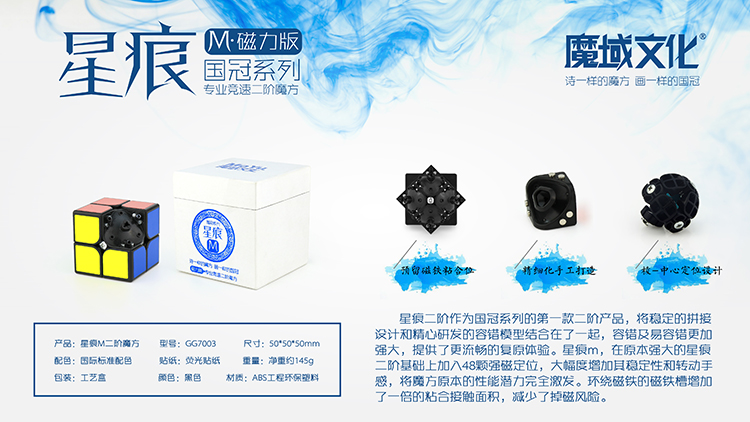 XingHen is the first 2x2 of brand GuoGuan, which combines stable construction and great corner-cutting together. Bigger corner-cutting gives the cube a superb hand feel. Xinghen M is an upgrade version of the standard one, which has magnets inside to provide better positioning. Inner slots design. Inner slots on edges and corners make the magnets attached tightly. Accurately, hand-placed magnets. Each magnet is properly placed to provide a good turning experience. Suitable magnetic force. After many trials, we have found the perfect strength of magnets in order to provide an outstanding performing cube. Anti-pop feet. Anti-pop feet on the bottom of hidden edge provides an outstanding anti-pop effect. Edge-center positioning design. 3 positioning hidden edges and 3 center piece is the positioning system of this 2x2, which is convenient and efficient. Tightness of 6 faces is controllable, bringing a more stable feel. Unified edge piece. Unified edge piece design avoids deformation and brings more stability!